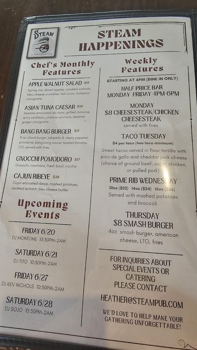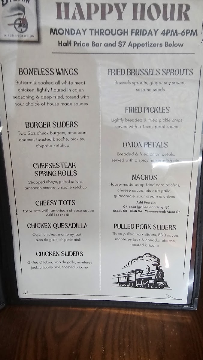 So whether it’s a casual family dinner, a night out with friends, or a quick stop for a satisfying bite, Steam Pub promises a delightful experience, full of flavor, warmth, and a touch of local charm. Visit today and make it your new favorite dining spot!